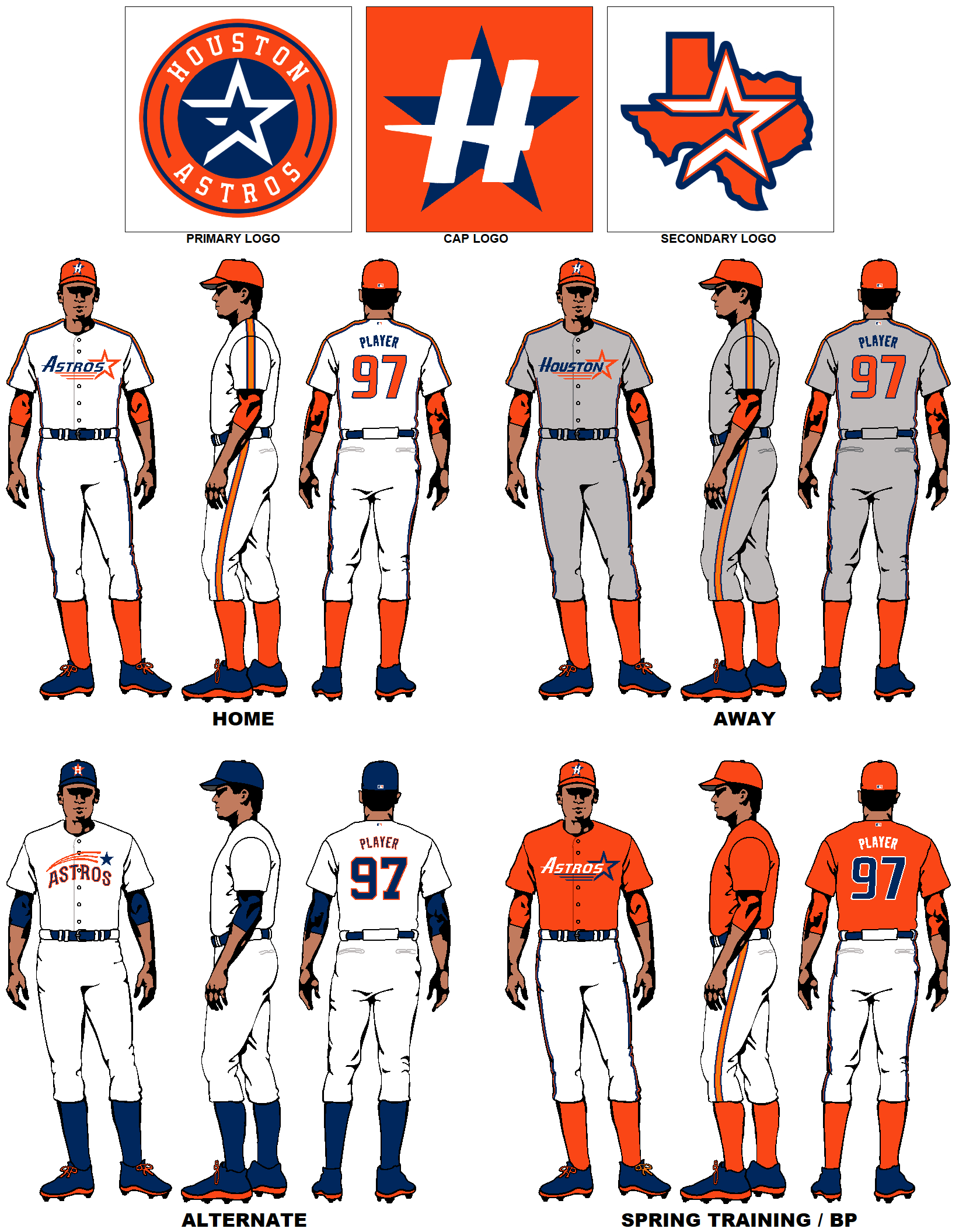 Houston Astros -  Moving them back to the NL, they always felt weird as an AL team. Their 1994 design feels modern and space-age fitting with their name. Keeping the star logo on the wordmark in this design, which feels like a natural evolution from their original shooting star design. The thicker shoulder and pant stripes also create a retro-futurist feel, and maintain their rainbow orange history. The alternate is a throwback to the original shooting star design.